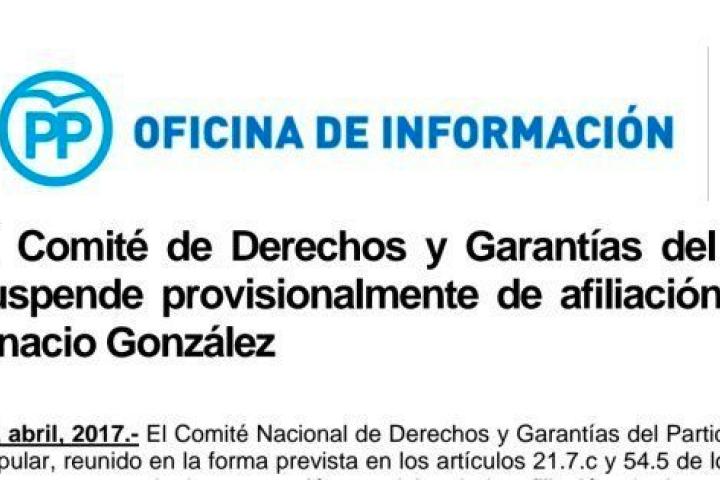 El Comité Nacional de Derechos y Garantías del Partido Popular, reunido en la forma prevista en los artículos 21.7.c y 54.5 de los Estatutos, acuerda la suspensión provisional de afiliación de Ignacio González, detenido en curso de la operación de la UCO desarrollada hoy en Madrid.