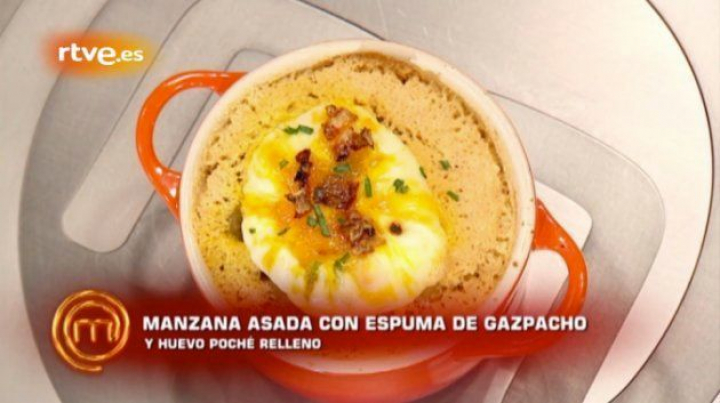 La misión de los concursantes era preparar un plato digno de estrella Michelin con un presupuesto de diez euros. Paloma optó por presentar una cazuelita con una manzana asada con espuma de gazpacho y huevo poché relleno.
