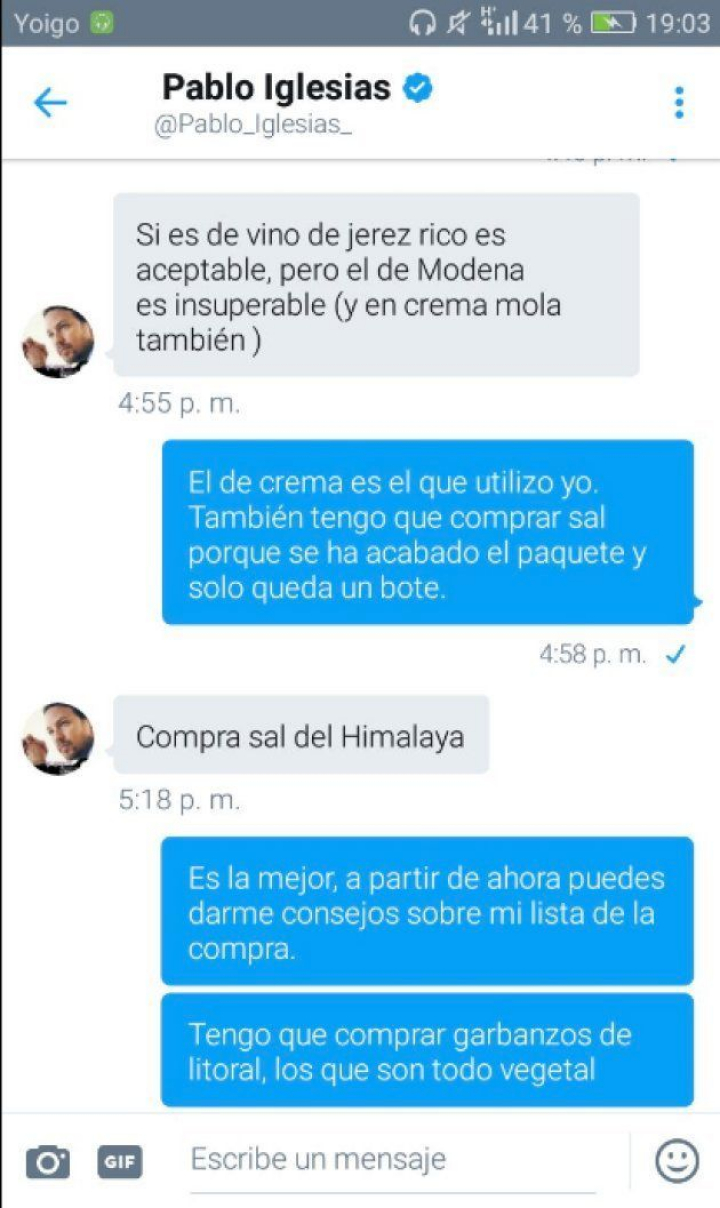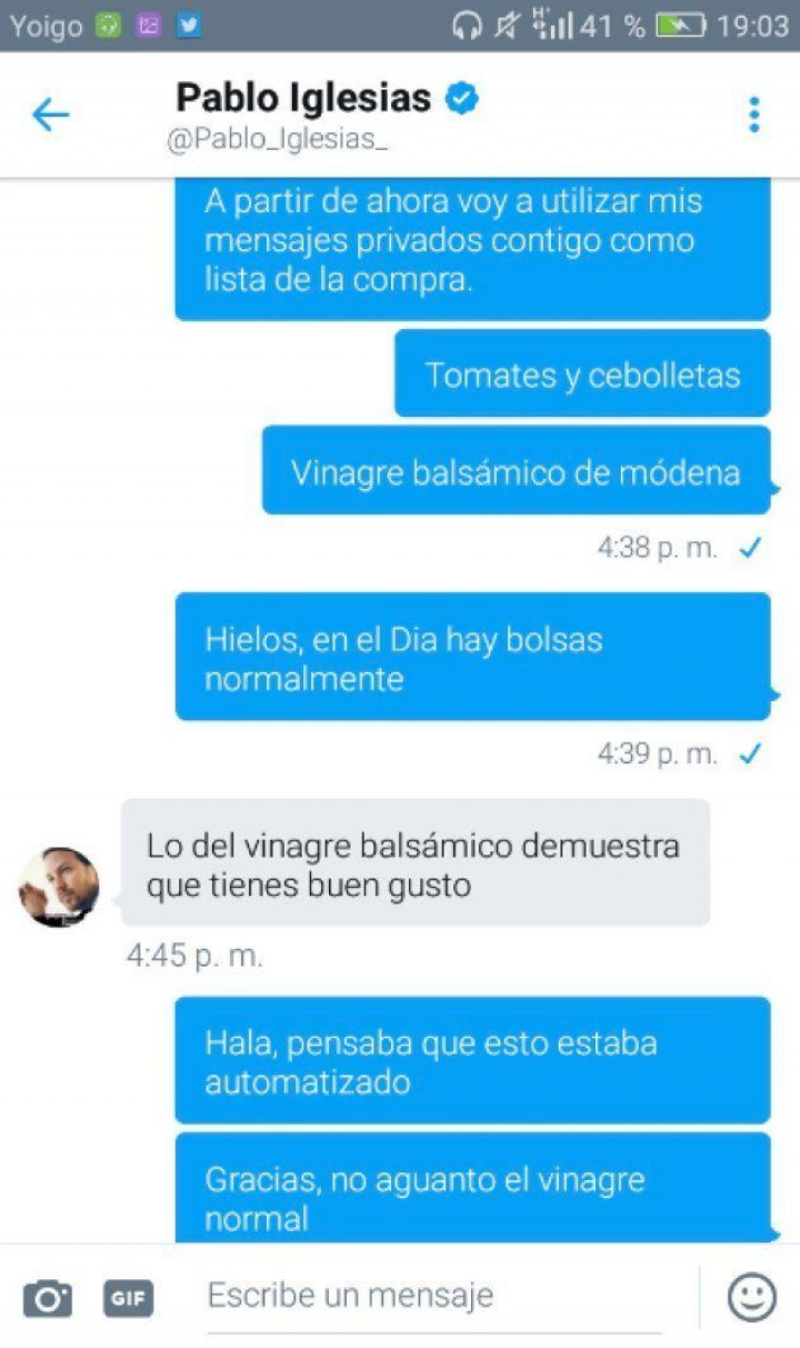 Un usuario utiliza los mensajes privados con Pablo Iglesias como lista de la compra... y él responde así