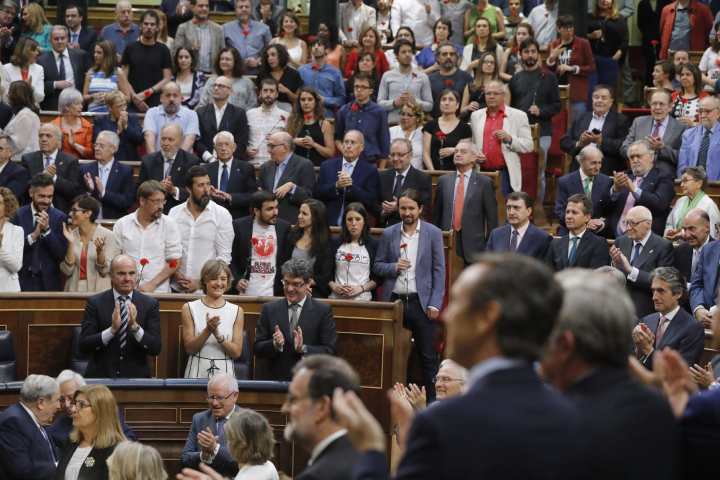 Los diputados de Podemos, Equo y de las confluencias de En Marea y En Comú han optado por llevar claves rojos como homenaje a los luchadores contra el franquismo.