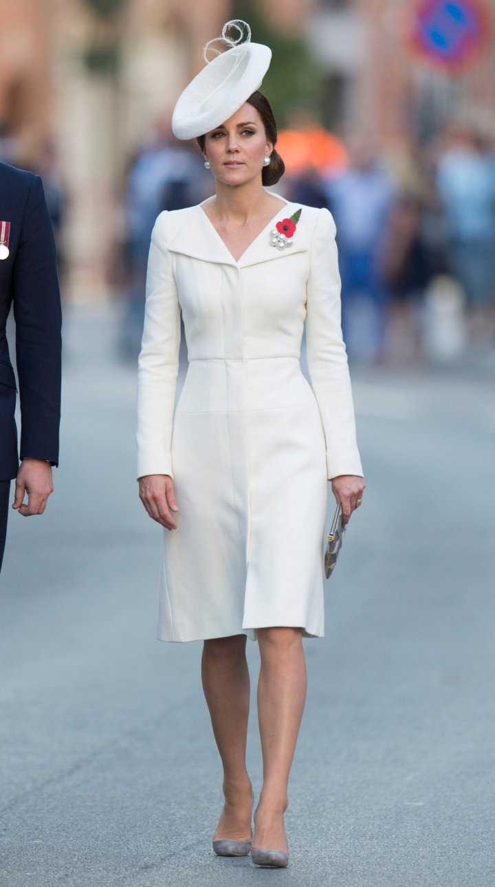 Así, Catalina llevó el domingo un vestido-abrigo blanco de Alexander McQueen durante un acto en memoria de los caídos en la I Guerra Mundial en Bélgica.