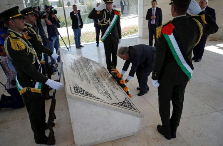 Antonio Guterres deposita una corona de flores ante la tumba de Yasser Arafat, el 'rais' palestino, esta mañana en Ramala.Mohamad Torokman / REUTERS