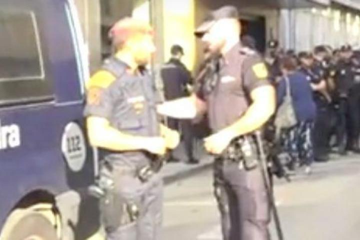 A las puertas de un hotel de Pineda, que alojaba a varios agentes, un policía nacional ha intercambiado su escudo con un mosso que se encontraba vigilando la zona.