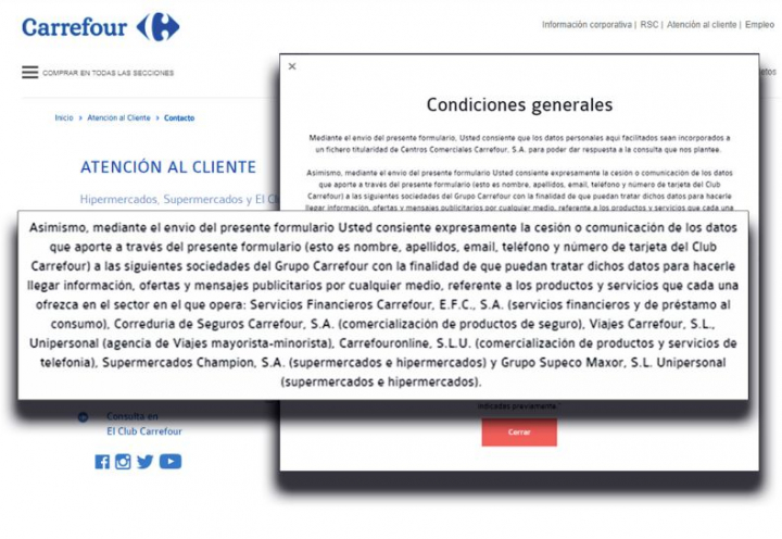 La web ofrece a los usuarios la posibilidad de contactar con Atención al Cliente, y les obliga a aceptar unas "condiciones generales", en las que les informa del uso que se va a hacer de sus datos personales. "Pero, realmente, esas condiciones generales esconden una trampa, ya que la aceptación de las mismas, requisito indispensable para enviar el formulario con la consulta, queja o reclamación correspondiente a la empresa, implica también la imposición de unas condiciones que nada tienen ya que ver con la protección de sus derechos, como la cesión de los datos a otras empresas del Grupo Carrefour con fines publicitarios", explican.