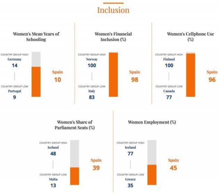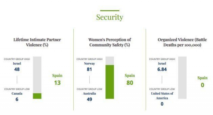 Según el estudio, España está en el grupo de apenas 30 estados que están en la parte alta de los tres apartados en los que se ha dividido la investigación: inclusión (abarca todo lo que hace libres a las mujeres para tomar decisiones en lo social, lo económico y lo político, como el nivel de empleo y educación, el acceso a tecnologías como los teléfonos móviles y la representación parlamentaria), justicia (reconocimiento en las normas del país, participación en trabajos fuera del hogar, negocios, tratamiento de la sociedad) y seguridad (en la familia, la comunidad cercana y la sociedad nacional).