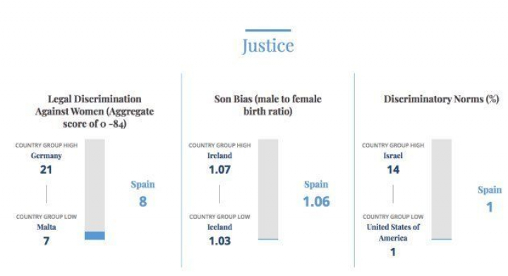 En cuanto a la discriminación legal contra la mujer, España logra un 8, cerca del 7 de Malta (el país de cabeza) y el 21 de Alemania (el menos bueno de los buenos), según un algoritmo que va de 0 a 84. En cuanto a normas discriminatorias, por porcentaje, se calcula en un 1% en nuestro país, empatado con EEUU, frente al 14% de Israel, el peor de los países más desarrollados.