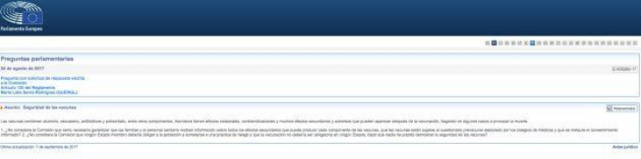 El comisario de Sanidad, Vytenis Andriukaitis, respondió a Senra asegurando que las vacunas sólo se autorizan "después de que su calidad, seguridad y eficacia hayan sido evaluadas" y que "la vacunación sigue siendo la intervención preventiva de salud pública más eficaz para proteger a la población frente a un gran número de enfermedades contagiosas".