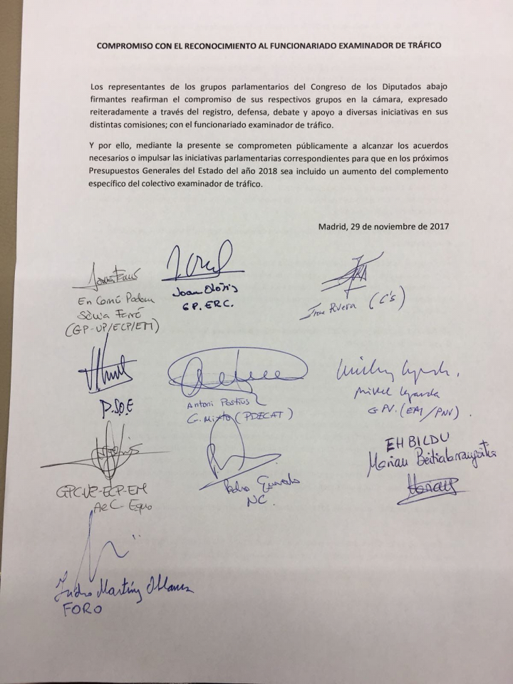 Todos los grupos parlamentarios, a excepción del PP, se han comprometido a impulsar las iniciativas parlamentarias correspondientes para que en los próximos presupuestos se incluya un aumento del complemento específico para los examinadores. "Hemos asegurado vía enmienda a los presupuestos que haya un incremento en el complemento de productividad, que supone 2,5 millones de euros", relata Rivera.