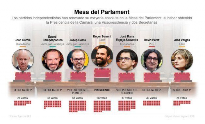 El Parlament se ha constituido este miércoles, arrancando así la XII Legislatura. En esta primera sesión se ha escogido a la Mesa, que estará presidida por Roger Torrent (ERC). Además, estará integrada por Josep Costa (Junts per Catalunya) y José María Espejo (Ciudadanos), como vicepresidentes, y Eugeni Campdepadrós (JuntsxCat), Alba Vergés (ERC), David Pérez (PSC) y Joan García (Cs) como secretarios. Por lo tanto, el independentismo dominará este órgano al contar con cuatro de los siete puestos.