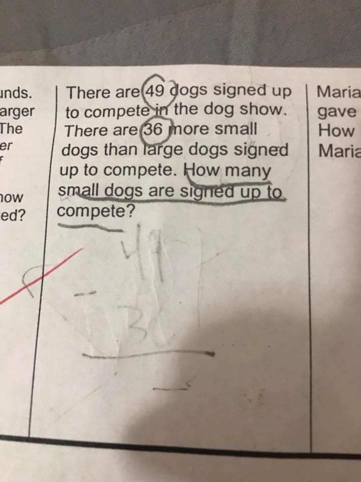 Según la madre, la solución se alcanza del siguiente modo: 49 - 36 = 13; luego se divide 13 entre 2, que da 6,5 y, finalmente, ese 6,5 se suma a 36: 42,5. De este modo, habría 42,5 perros pequeños y 6,5 grandes, 36 más de los primeros.