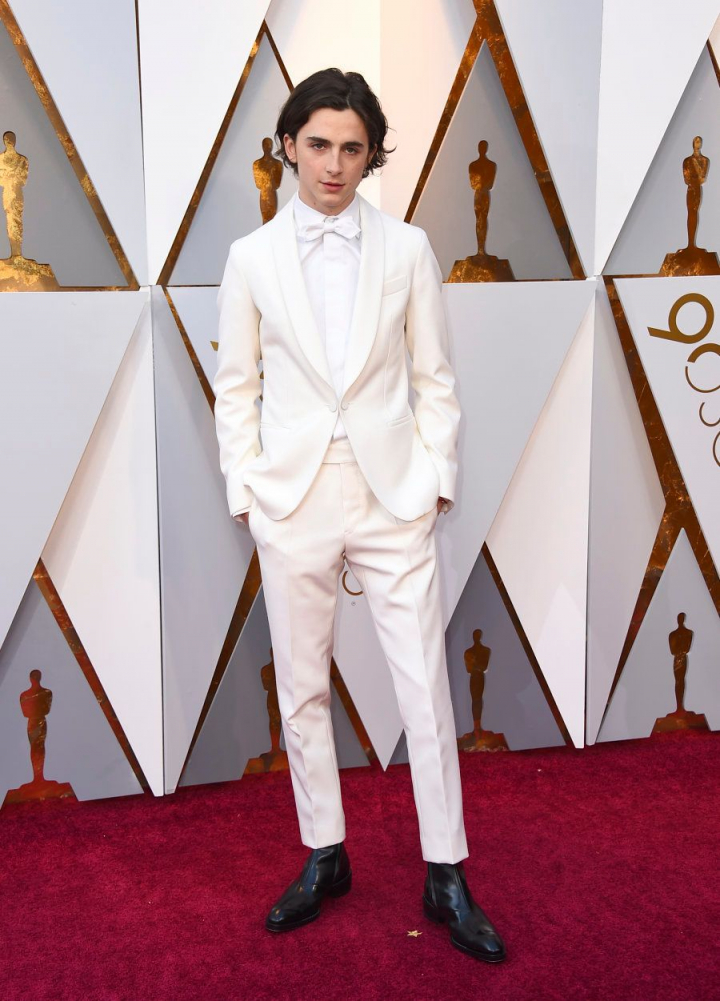 Puede que un esmoquin blanco con botines negros sea una elección arriesgada, pero si se sabe defender también es un acierto. Es el caso de Timothée Chalamet. El protagonista de Call me by your name ha mostrado la confianza suficiente para lucir su diseño de Berluti y salir airoso.