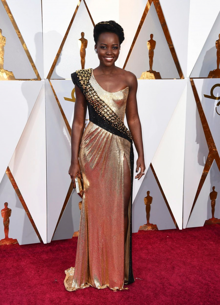 Es el año de Versace, así que no era de extrañar que alguien se decantase por la firma italiana en la alfombra roja. Lupita Nyong'o decidió rivalizar con la estatuilla de los Oscar al acudir de dorado y salió ganando acompañada por sus compañeros de reparto en Black Panther.