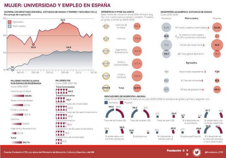 Con motivo de la celebración del Día Internacional de la Mujer la Fundación CYD (Conocimiento y Desarrollo) ha elaborado un diagnóstico sobre la evolución de la mujer en la universidad española, una reflexión sobre su participación, en matriculados, titulados y profesorado, su desempeño académico y su inserción laboral. El estudio se ha realizado a partir de información del Ministerio de Educación, Cultura y Deporte y el Instituto Nacional de Estadística.