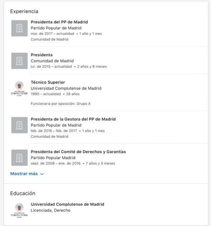 La falta de detalle en la sección "Educación" contrasta con la prolijidad con la que se ha completado el apartado "Experiencia", en la que figuran todos los cargos que Cifuentes ha ostentado.