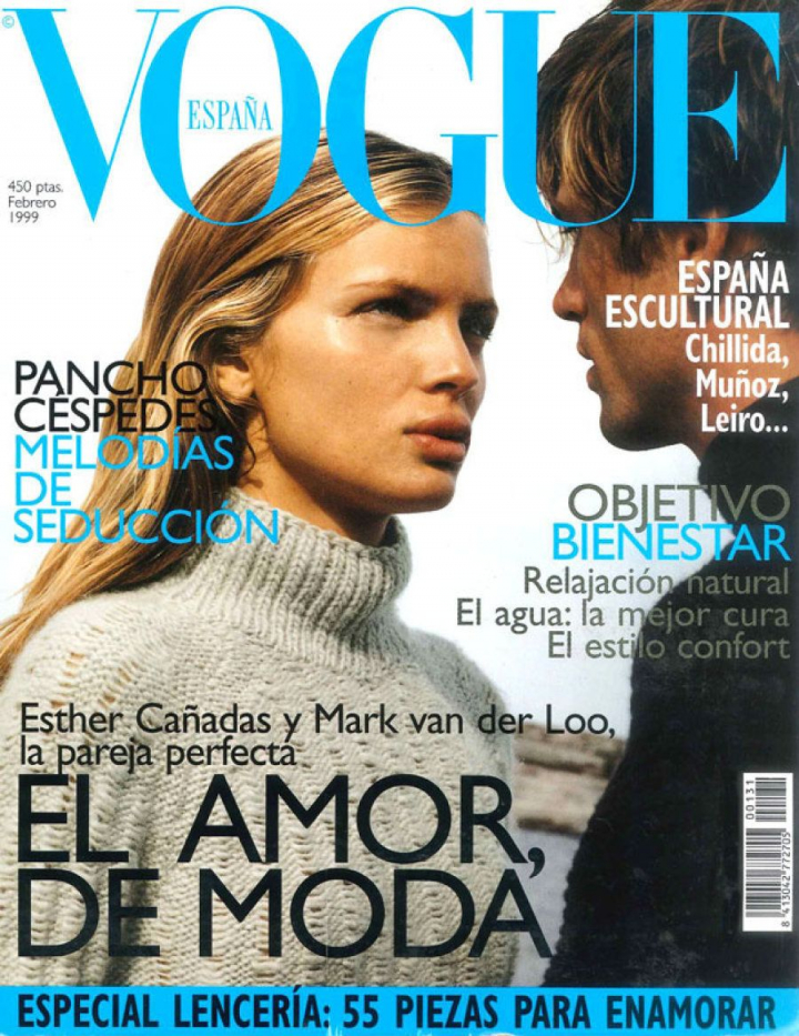 Ella era una de las caras más visibles de la moda española en el exterior, y el es conocido por ser uno de los primeros top models masculinos. La relación tanto profesional —juntos protagonizaron algunas míticas campañas de Donna Karan— como personal de Esther Cañadas y Mark Vanderloo hizo las delicias de fotógrafos y diseñadores en todo el mundo. El gran protagonismo de esta imagen lo acapara Cañadas, pero el modelo holandés tuvo el honor de ser el primer hombre de aparecer en la portada de Vogue España.