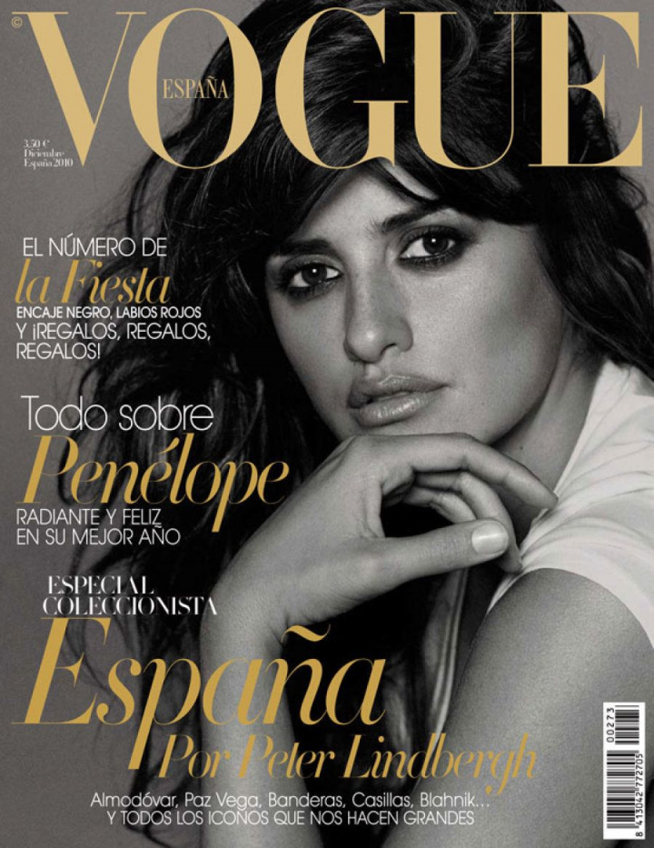La actriz madrileña es la persona que más veces ha protagonizado la portada de Vogue España, ni más ni menos que en once ocasiones. Para cerrar con broche de oro el 2010, Cruz posó frente ante la cámara de Peter Lindbergh en un reportaje en el que también participaron modelos como Bimba Bosé o Jon Kortajarena. Cruz protagonizó su primera portada para la revista en noviembre 1998, cuando triunfaba con La niña de tus ojos.