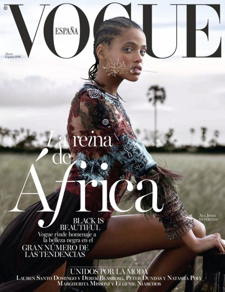 Un precioso homenaje a la cultura africana de la mano de la modelo Aya Jones y el fotógrafo Nico Bustos. Ataviada con un vestido de Valentino y luciendo cornrows, unas trenzas propias de la cultura africana, la revista cautivó a los lectores, que no dudaron en aplaudir la elección en foros especializados como The Fashion Spot, donde algunos se aventuraron a calificarla como la mejor portada de Vogue España que se recuerda.