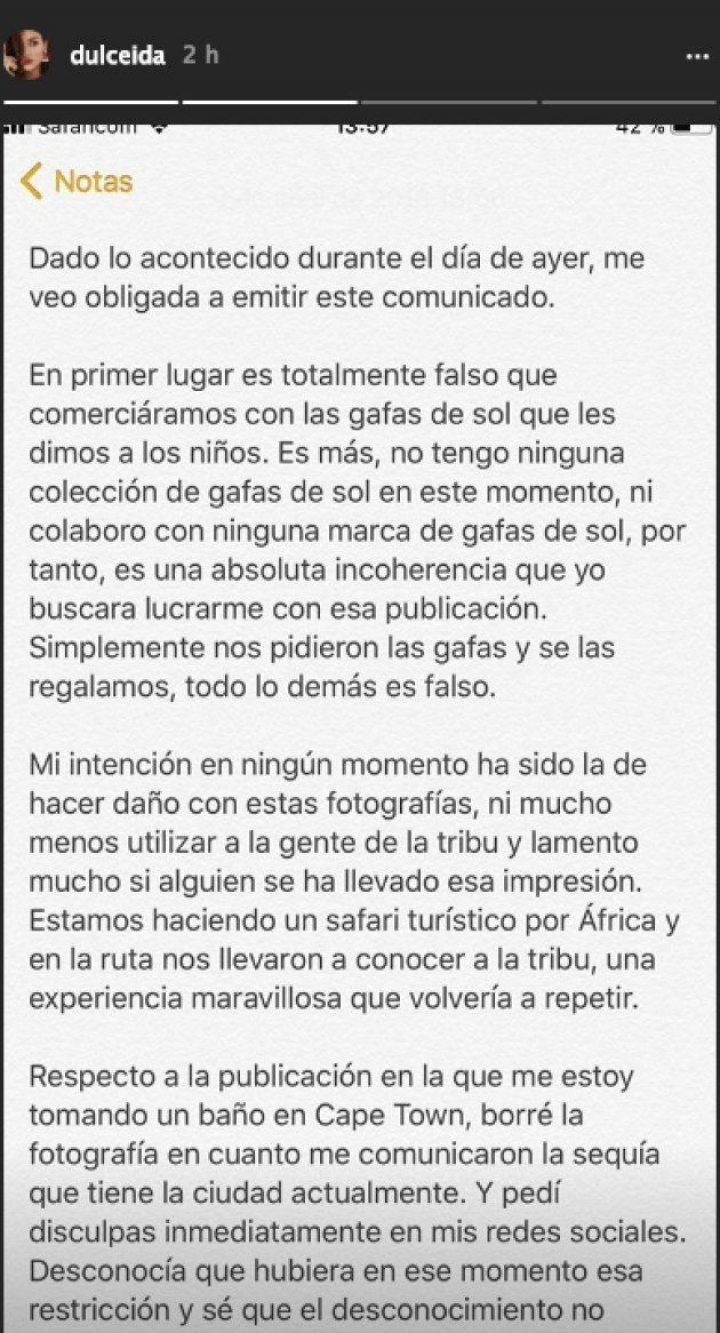 El culebrón Dulceida en Sudáfrica tiene nuevo capítulo. Después de las críticas que le llovieron este lunes por regalar, supuestamente, gafas de su marca a niños en Ciudad del Cabo y tras lanzar un breve mensaje en Twitter a sus haters, la influencer ha decidido emitir un comunicado sobre lo ocurrido. Esta vez ha recurrido a Instagram Stories, donde publicó las polémicas fotos, para dar su versión de los hechos.