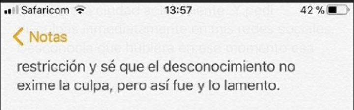 En la publicación asegura que no buscaba lucrarse ni hacer daño con esas fotografías y se refiere también a su imagen dándose un baño en Ciudad del Cabo. "Desconocía que hubiera en ese momento esa restricción y sé que el desconocimiento no exime la culpa, pero así fue y lo lamento", escribe.