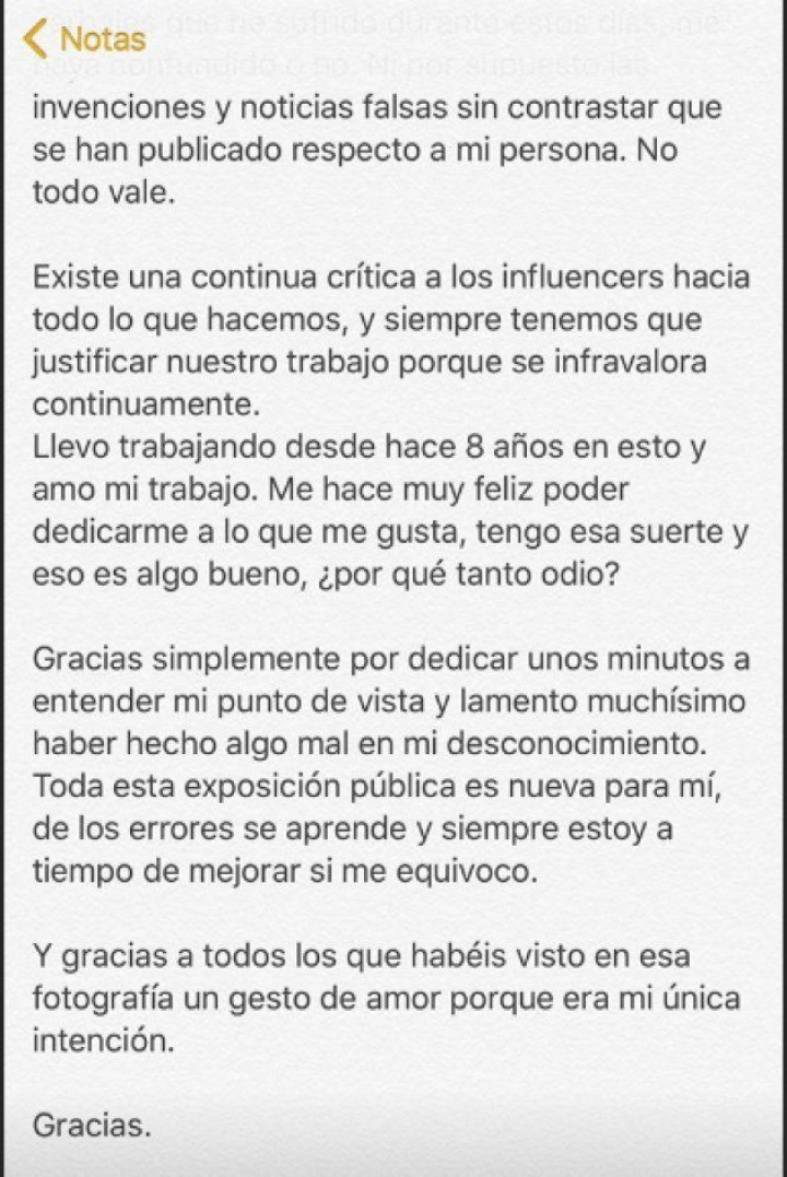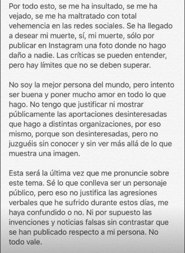 Y termina la publicación diciendo que será la última vez que hable del tema. "Sé que soy un personaje público pero esto no justifica las agresiones verbales que he recibido estos días, me haya confundido o no", asegura, poco antes de terminar su publicación, en la que también tiene un gesto hacia las personas que no la juzgaron.