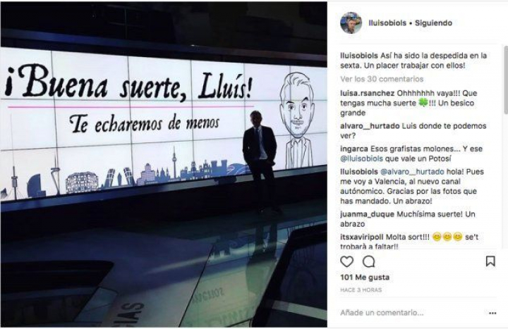 El propio Obiols se ha despedido en Instagram de sus compañeros. "Así ha sido la despedida en LaSexta. ¡Un placer trabajar con ellos!", ha escrito el meteorólogo, que ha compartido una imagen con el homenaje que le han hecho sus compañeros. En ella se ve un retrato de él y la siguiente frase: "¡Buena suerte, Lluís! Te echaremos de menos".