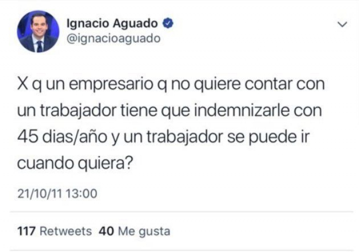 El portavoz de Ciudadanos en la Asamblea de Madrid, Ignacio Aguado, ha tenido que borrar un tuit suyo de 2011 en el que escribía: "Por qué un empresario que no quiere contar con un trabajador tiene que indemnizarle con 45 días/año y un trabajador se puede ir cuando quiera".