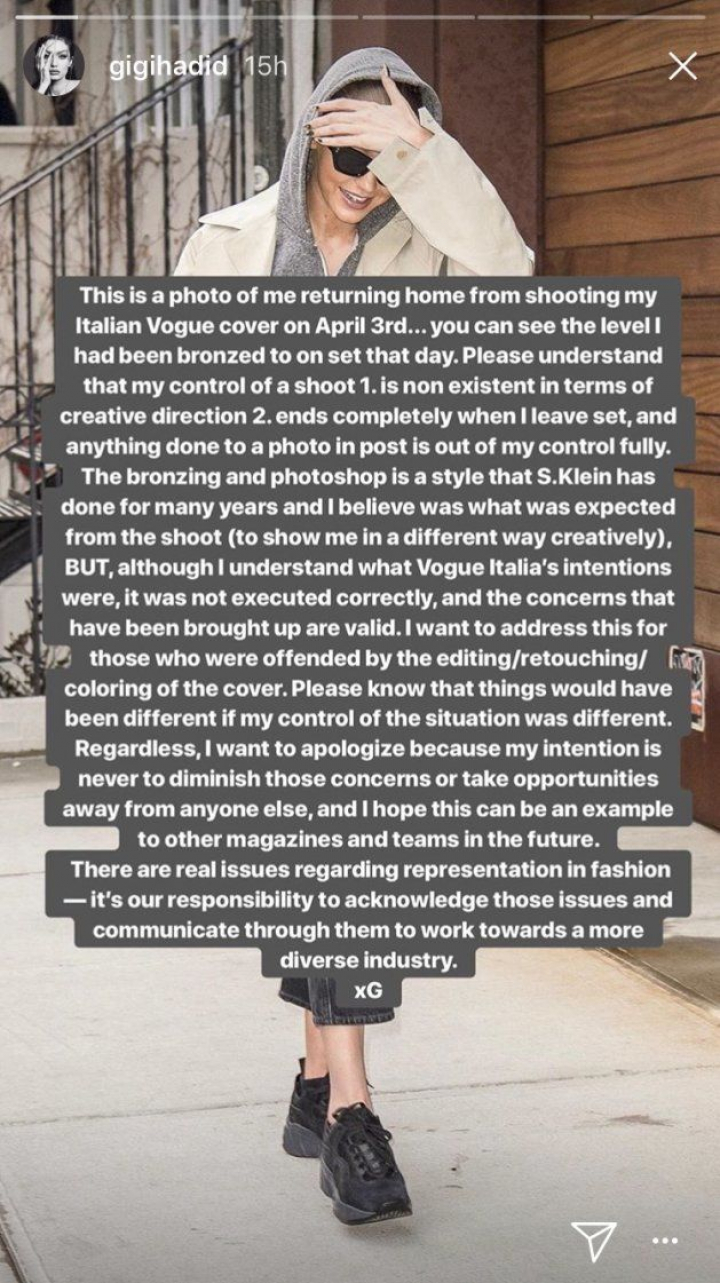 Además, Hadid, una de las modelos más cotizadas actualmente, reconoce que pese a que las intenciones de Vogue Italia eran buenas, la portada "no se ejecutó correctamente" y que las "inquietudes" despertadas tras la publicación son legítimas. Hadid quiso pedir disculpas y animar a que la polémica sirva de ejemplo para el futuro y su intención de trabajar por una industria de la moda más inclusiva.