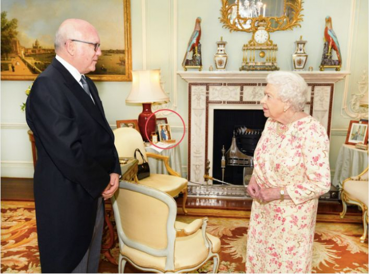 En una fotografía tomada este miércoles de un encuentro entre la monarca y George Brandis, el Alto Comisionado de Australia en el Reino Unido, algunos han demostrado que tienen vista de águila y han descubierto una imagen nunca vista de los duques de Sussex que reposaba enmarcada encima de una mesa.