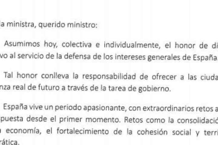 "Querida ministra, querido ministro", arranca la misiva, en la que dice: "Asumimos hoy, colectiva e individualmente, el honor de dirigir el Poder Ejecutivo al servicio de la defensa de los intereses de España".