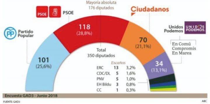 Las mejores noticias para el nuevo inquilino de La Moncloa llegan desde el ABC, cuya encuesta, realizada por GAD3 tras la moción de censura, da la victoria a los socialistas con el 28,8% de los votos y 118 escaños.