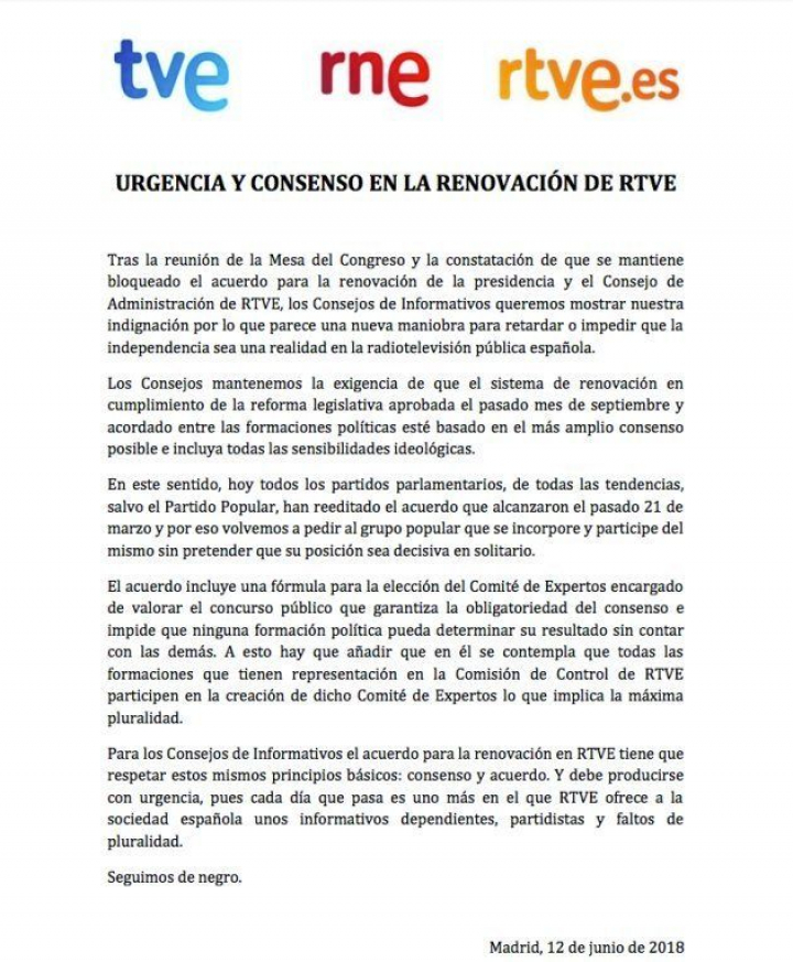 "Los Consejos de Informativos queremos mostrar nuestra indignación por lo que parece una nueva maniobra para retardar o impedir que la independencia sea una realidad en RTVE", aseguran los trabajadores de RTVE en el comunicado.