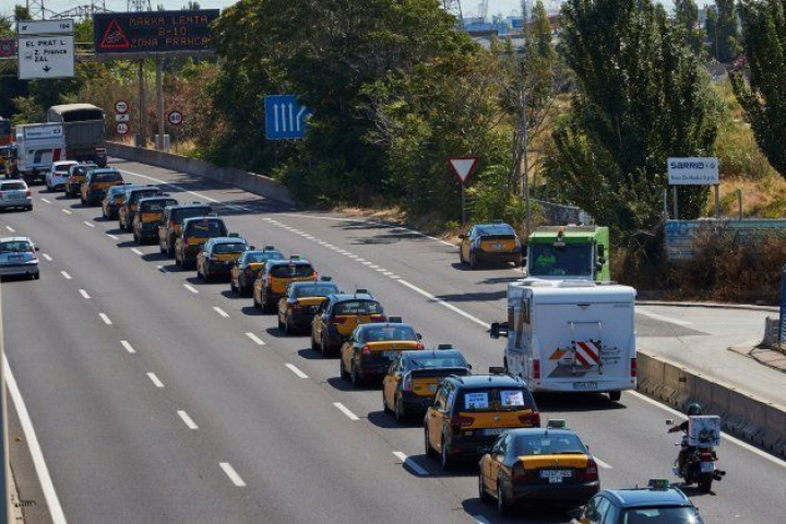 Reunidos en el aeropuerto del Prat de Barcelona, cientos de taxistas han marchado lentamente hasta el puerto, generando una kilométrica retención en el acceso sur de la ciudad.