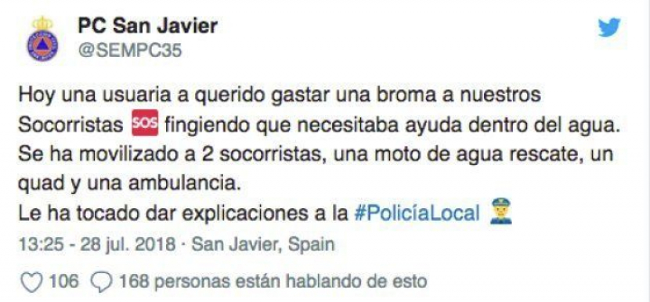 "Hoy, una usuaria ha querido gastar una broma a nuestros socorristas fingiendo que necesitaba ayuda dentro del agua. Se ha movilizado a dos socorristas, una moto de agua de rescate, un quad y una ambulancia. Le ha tocado dar explicaciones a la Policía Local".
