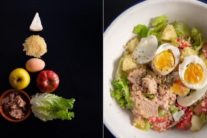 ▶️ Ingredientes (para dos personas): unas hojas de lechuga, un tomate, una manzana, una lata de atún, un puñado de cuscús (y la misma cantidad de agua), un huevo cocido, un trozo de queso.