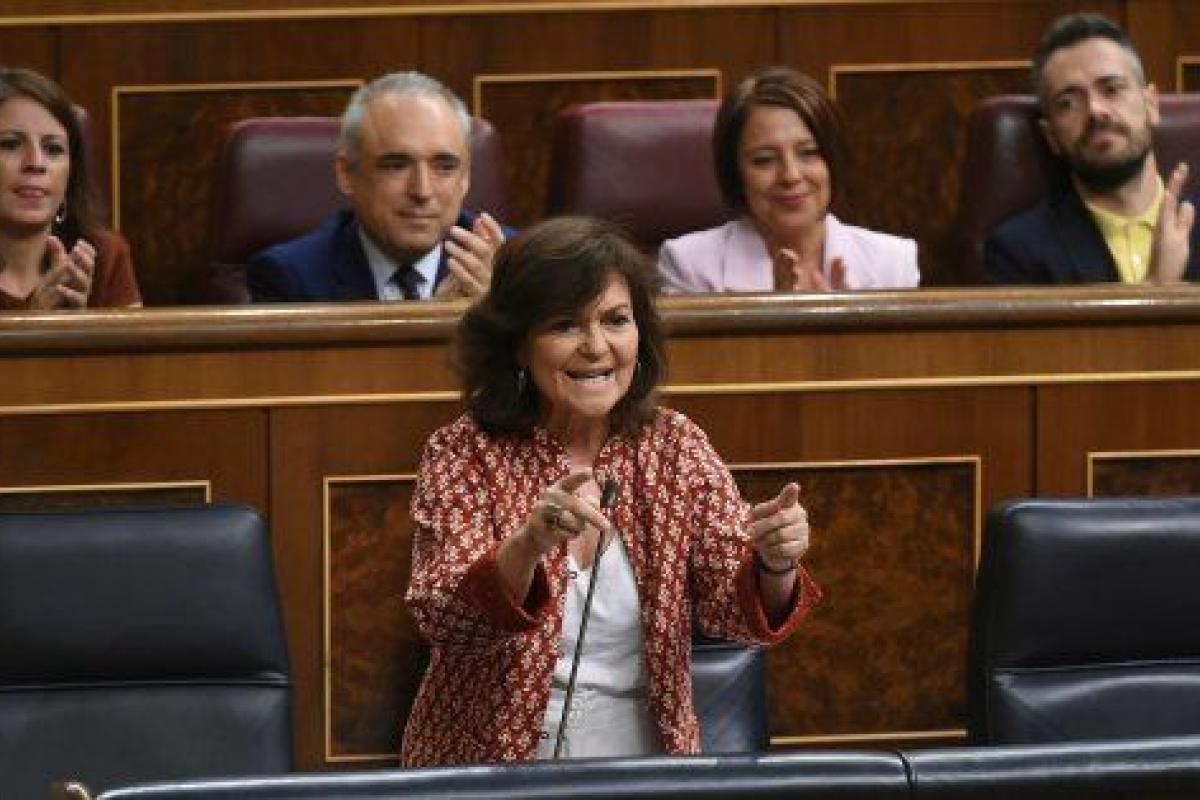 En ausencia del presidente del Gobierno, Pedro Sánchez, en Nueva York para asistir a la Asamblea General de la ONU, la vicepresidenta del Ejecutivo, Carmen Calvo, ha sido la encargada de afrontar la sesión de control de este miércoles en el Congreso. Y lo ha hecho frente a un PP y un Ciudadanos que reclaman un adelanto electoral, que censuran al gabinete por ser un "fraude" y por "mentir" y que han usado a la ministra de Justicia, Dolores Delgado, como diana de sus críticas.
