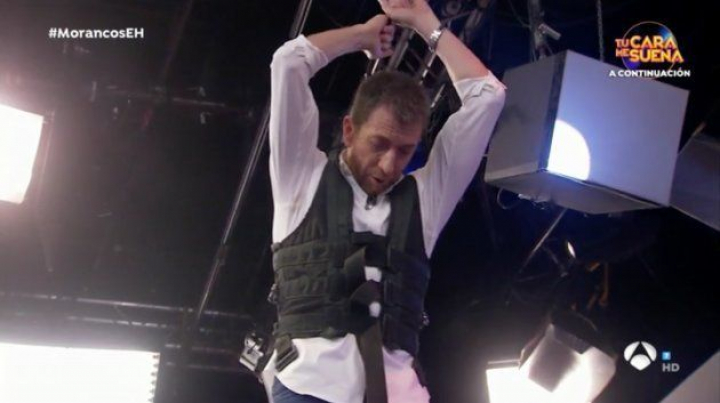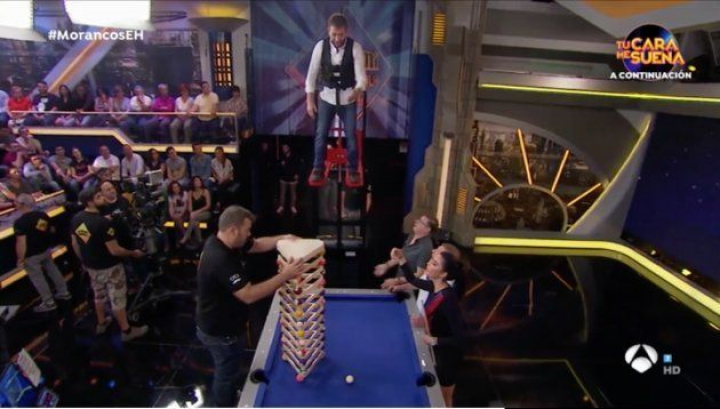 Mientras los operarios se lo colocaban al presentador y lo elevaban sobre la mesa, Rubio explicó en qué consistía el truco que iba a intentar: construir una torre de 12 plantas con triángulos apoyados sobre bolas de billar.