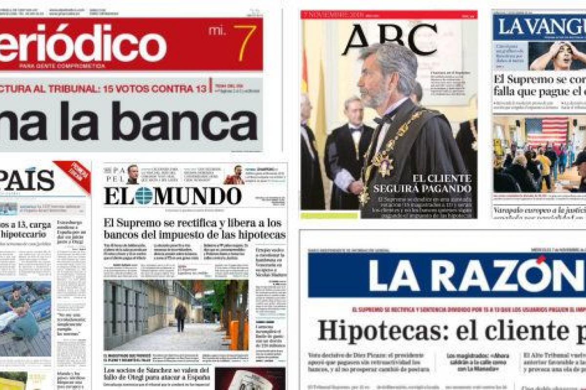 Por ejemplo, El País explica que se "carga" sobre el ciudadano el peso del impuesto; El Mundo opta por decir que se "libera" a los bancos del abono; "El cliente seguirá pagando", explica ABC, mientras que La Razón lo resume con: "El cliente paga". La Vanguardia enfatiza la corrección en la decisión y 20 Minutos destaca que el TS "se parte en dos", aludiendo a los ajustado de la votación. El Periódico, sin más, acude a la negrita y al cuerpo gigante para titular: "Gana la banca".