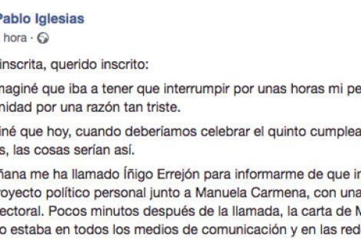 Contundente. El líder de Podemos, Pablo Iglesias, ha publicado un mensaje en Facebook para los afiliados por el movimiento de Íñigo Errejón de presentarse en la Comunidad de Madrid bajo la marca Más Madrid -la misma que Manuela Carmena-. Y no defrauda por el tono empleado y sus expresiones: