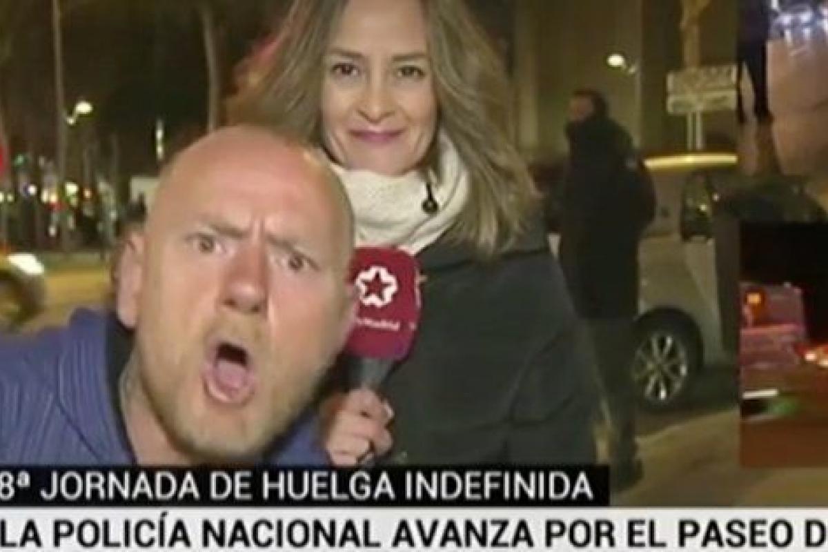 Sanz estaba informando desde Atocha de la huelga de taxistas en Madrid cuando un hombre evidentemente alterado se coló en el plano de cámara dando gritos.