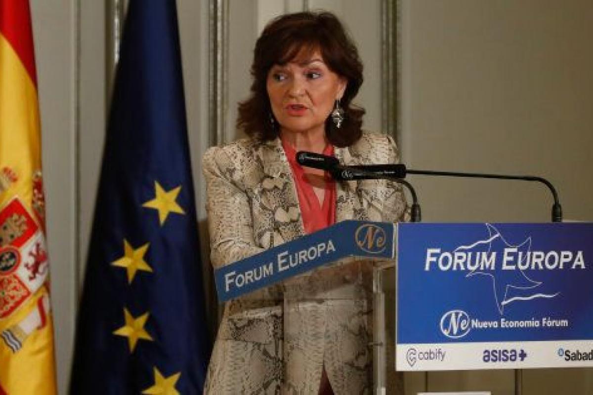 "Nos parecerá muy bien que los sindicatos convoquen paros. La participación, la manifestación, la presión legítima y pacífica de las mujeres en el amplio mundo del movimiento feminista al que pertenezco desde siempre estarán aquí", ha declarado la vicepresidenta del Gobierno, Carmen Calvo, este miércoles en un desayuno informativo de Nueva Economía Fórum.