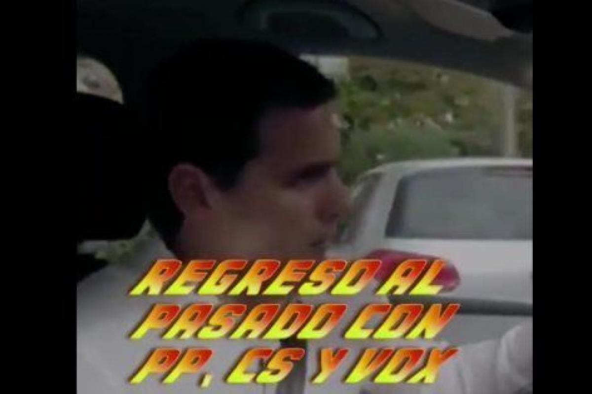 Durante los 43 segundos, el PSC ha retratado a Rivera conduciendo el mítico DeLorean del filme Regreso al futuro, a Abascal con su famoso paseo a caballo y a Casado lo ha colocado con Aznar en un mitin político del partido.