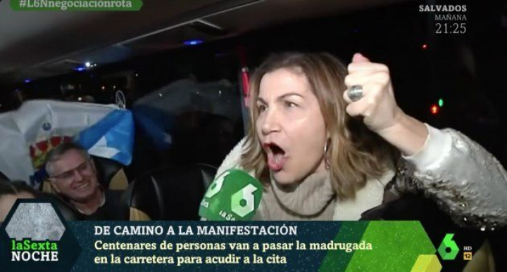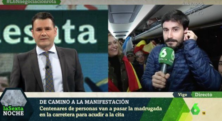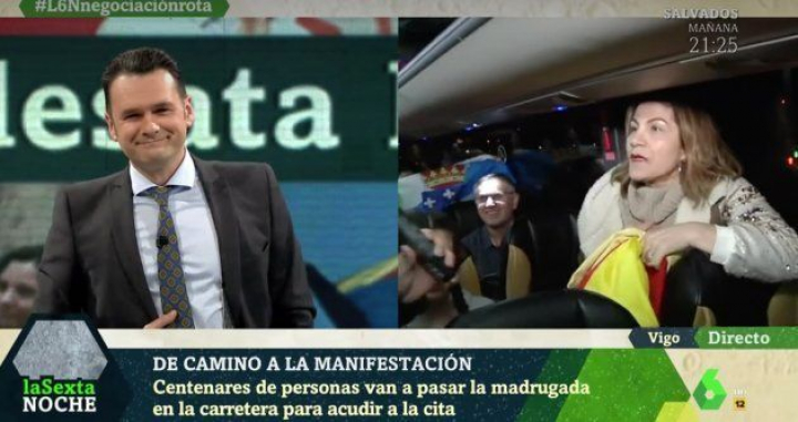 Iñaki López, presentador de LaSexta Noche, no sabía dónde se metía cuando pidió a su compañero Carlos Prado, reportero de la cadena, que preguntara a una de las militantes del PP que coreaban lemas dentro del autobús que les llevaba desde Vigo a Madrid para participar en la manifestación convocada por su partido y Ciudadanos para este domingo en la capital.