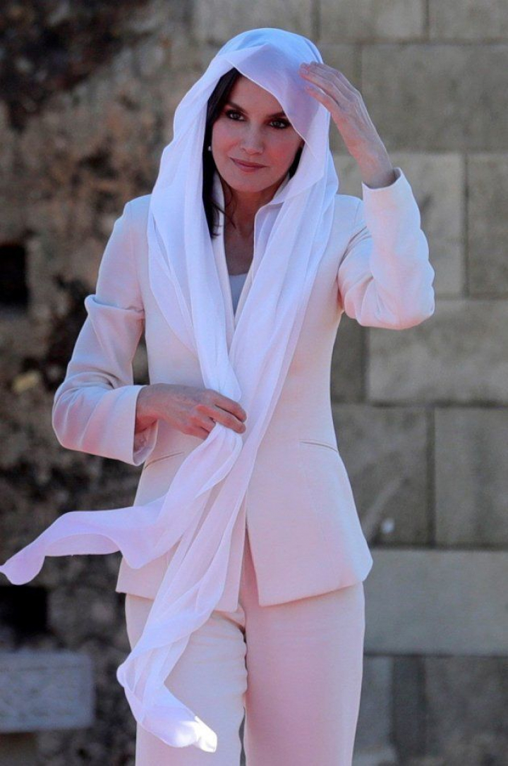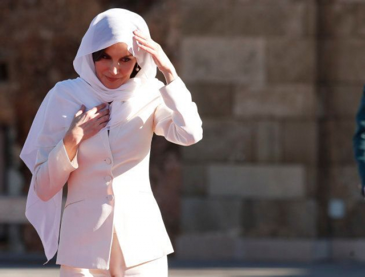Los Reyes han depositado sendas coronas con la bandera española y la leyenda "SS.MM. los Reyes de España" en las tumbas, situadas en un edificio de estilo clásico marroquí construido en los años 60. Como corresponde por protocolo, la reina Letizia ha acudido con un velo cubriéndole la cabeza.