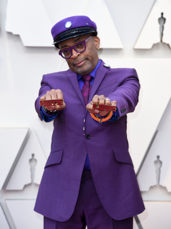 Lee, nominado a Mejor director, caminó por la alfombra roja con su esposa, Tonya Lewis Lee. Pero el homenaje al artista fallecido en abril de 2016 no fue solo al cantante, también se acordó de su película de 1989 Haz lo que debas con dos anillos que ponían "Hate" y "Love" (odio y amor).