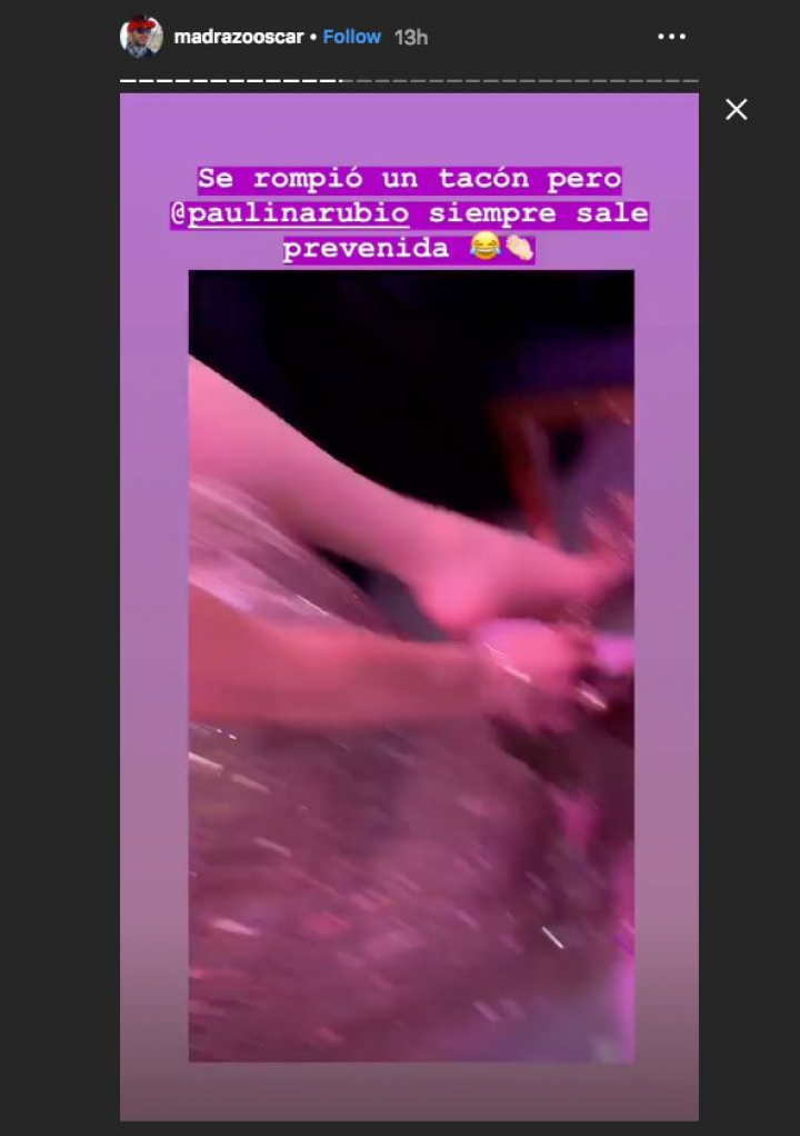 Su amigo Óscar Madrazo retransmitió algunos de los momentos de la fiesta en sus stories de Instagram, en los que se puede ver a Paulina Rubio cambiarse el calzado después de romperse el tacón.