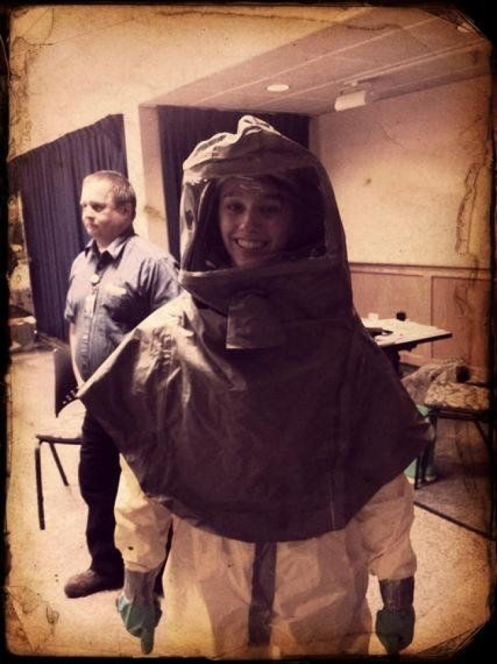 El equipo de protección personal (PPE) es una expresión generalizada para nombrar los trajes, botas, guantes y mascarillas que llevan los individuos que van a entrar en una zona de peligro. Es increíblemente difícil moverse con estos trajes. Llevamos varias capas de guantes, que prácticamente eliminan nuestra destreza, y gorros que limitan el campo de visión. Los trajes producen un calor casi insoportable. El respirador artificial proporciona aire limpio, pero no aire fresco. Estos trajes están hechos para la protección, no para la comodidad. Antes de ponértelo, te tienen que medir las constantes vitales. No puedes actuar con el traje durante más de media hora (si es que aguantas media hora con él). Los golpes de calor son muy frecuentes llegados a cierto punto. Tienes que estar completamente hidratado y tranquilo antes de ponértelo. Cuando salgas de él, tienen que volver a tomarte las constantes, y seguro que habrás notado el impacto. Aunque sólo hayas dado unos pasos con el traje, sentirás haber corrido una maratón en un día caluroso de verano.