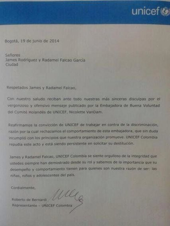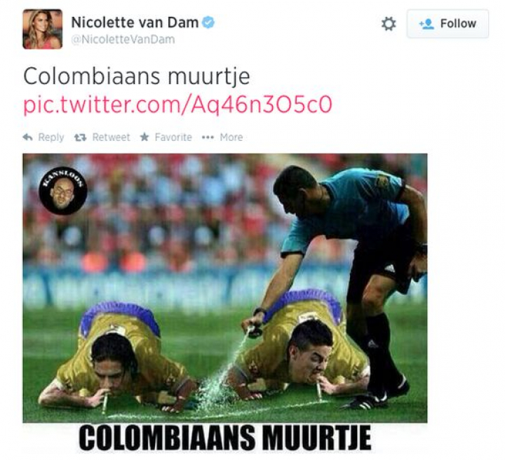 Hace una semana la actriz holandesa y embajadora de buena voluntad de Unicef, Nicolette Van Dam, publicó un desafortunado tuit que ofendió a los hinchas Colombianos que siguen el mundial de fútbol en Brasil. Van Dam publicó un fotomontaje de dos jugadores de la selección de Colombia, arrodillados en el campo de juego y aspirando como si fuera cocaína, el polvo blanco que están usando los árbitros del mundial para demarcar la cancha durante los partidos.
