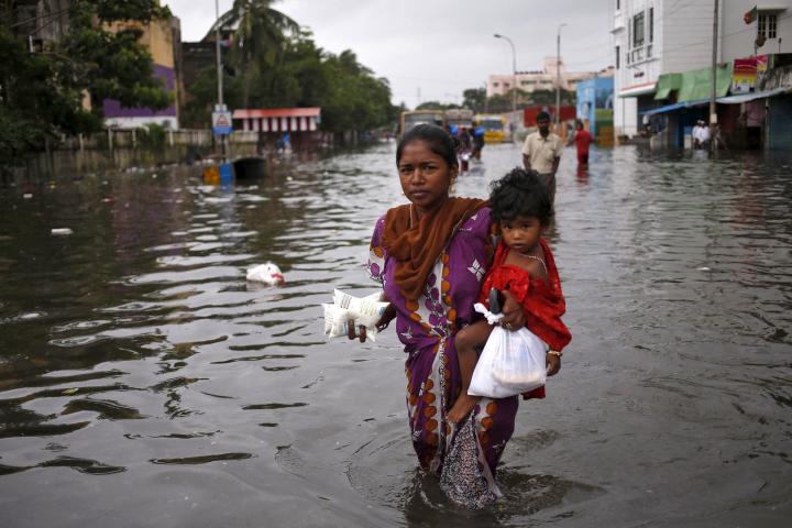 Foto de una mujer llevando a su hijo y unas bolsas de leche tras por una calle inundada de Chennai, India. ANINDITO MUKHERJEE/REUTERS