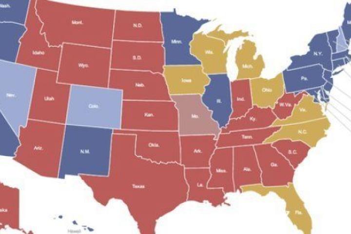 A primera vista, estados como California con sus 55 electores y Tejas con sus 38 parecen importantes, pero California es firmemente demócrata (azul) y Tejas, republicano (rojo). Estos y los otros estados "sólidos" forman la base de votos "seguros" de cada candidato. Pero es en los estados "en juego" donde se da la gran batalla.
