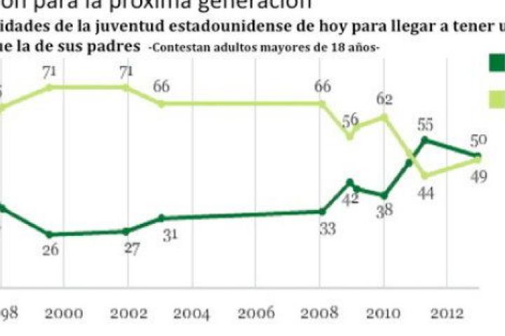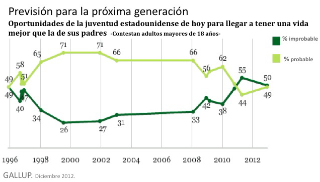 Estos resultados contrastan con el sentir de los adultos a la hora de contestar a la misma pregunta en una encuesta realizada a finales de 2012, poniéndose de relieve la incertidumbre que acompaña a la coyuntura actual y la profunda división de perspectivas que caracteriza a la bipolar sociedad estadounidense. Así, el 50% consideró que resulta improbable que los menores puedan llegar a vivir mejor que ellos, frente al 49% que sí mantiene la esperanza. Este resultado es menos pesimista que el obtenido en 2011 cuando el 55% de los mayores de 18 años no creían en una vida mejor para sus hijos. Esta tendencia tan desesperanzada no se repetía desde 1995, durante la primera administración de Bill Clinton. Es cierto que el optimismo crece ente los votantes demócratas, hasta un 66% continúa confiando en las políticas de Obama para recuperar la prosperidad, mientras que la desesperación se apodera del votante republicano (apenas el 29% tiene la percepción de que el porvenir para sus hijos será mejor que el suyo).